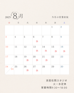 8月の営業日時です 8/13~16日、21日は休業となります。 お問い合わせ、ご来店は上記休業日以外にてお願いいたします。 京扇石岡スタジオ(sharaku石岡店) 火曜・水曜定休 0299-26-7878 9:30~18:00