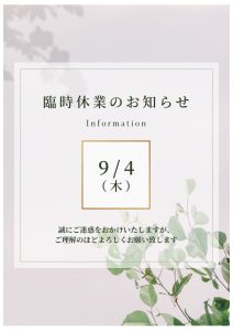 9/4(木)は社員研修の為、臨時休業とさせていただきます